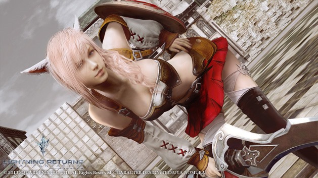 To be more literal about it: ever since Final Fantasy XIII-2 introduced DLC costumes and such to the franchise for the first time in a flagship title, you must have known this sort of thing was coming. This picture, if you don’t know, is promo for Lightning Returns: Final Fantasy XIII, but is also cross-promotion for the upcoming Final Fantasy XIV: A Realm Reborn. Specifically, that outfit she’s wearing is the default racial costume for mi’qote female characters when they start the game. Lightning happens to be wearing it. There’s also going to be a reverse promotion, by the way, for FF14:ARR characters to wear Lightning’s FF13 Guardian Corps default outfit, Snow’s outfit, etc. as well.