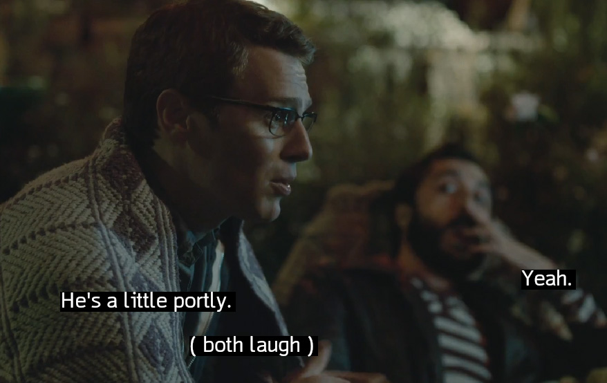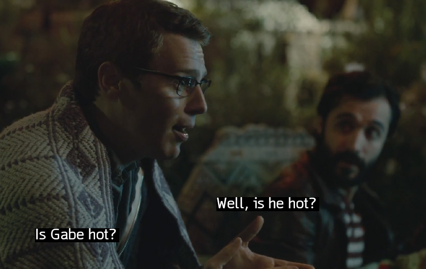 Shortly after the first episode opens, main characters Patrick, Augustin, and Dom are chatting about Patrick’s ex-boyfriend and his new fiancee, who are soon to be married. Patrick and co. have been invited to the bachelor party, and the conversation turns towards the new boyfriend, Gabe. As the conversation proceeds, it turns to the question in the subtitles in the image above: Patrick’s friends ask if Gabe is “hot.”