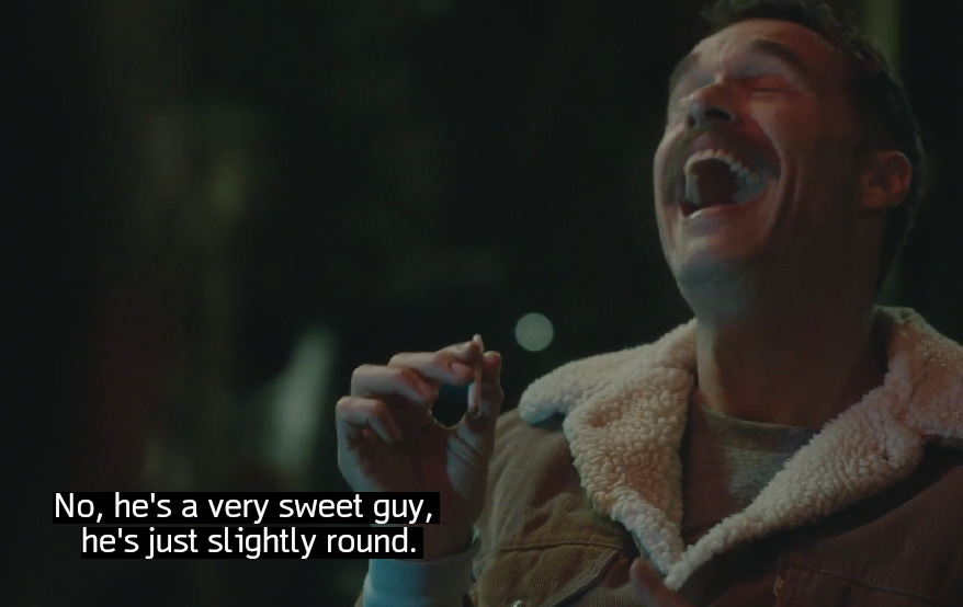 The laughter continues. Patrick continues, saying “No, he’s a very sweet guy, he’s just… slightly round” while his friends laugh their asses off in the background, including the camera’s focus on Dom’s intense amusement.